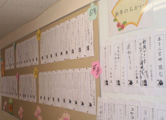 廊下に全校児童と全教職員の「新年の近い」が掲示されています。