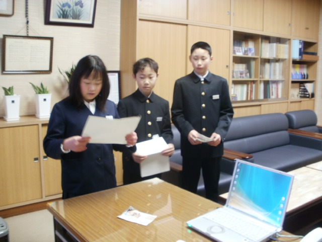 自分が気になった記事を取り上げ、なぜ気になったのか理由を言い、内容を要約して、最後に 自分の考えを述べます。朝,教室でスピーチする前に校長室に来て練習します。