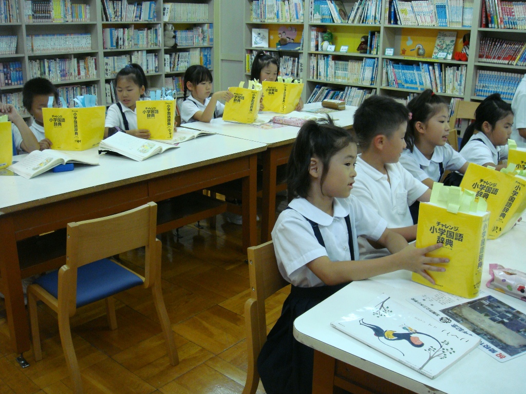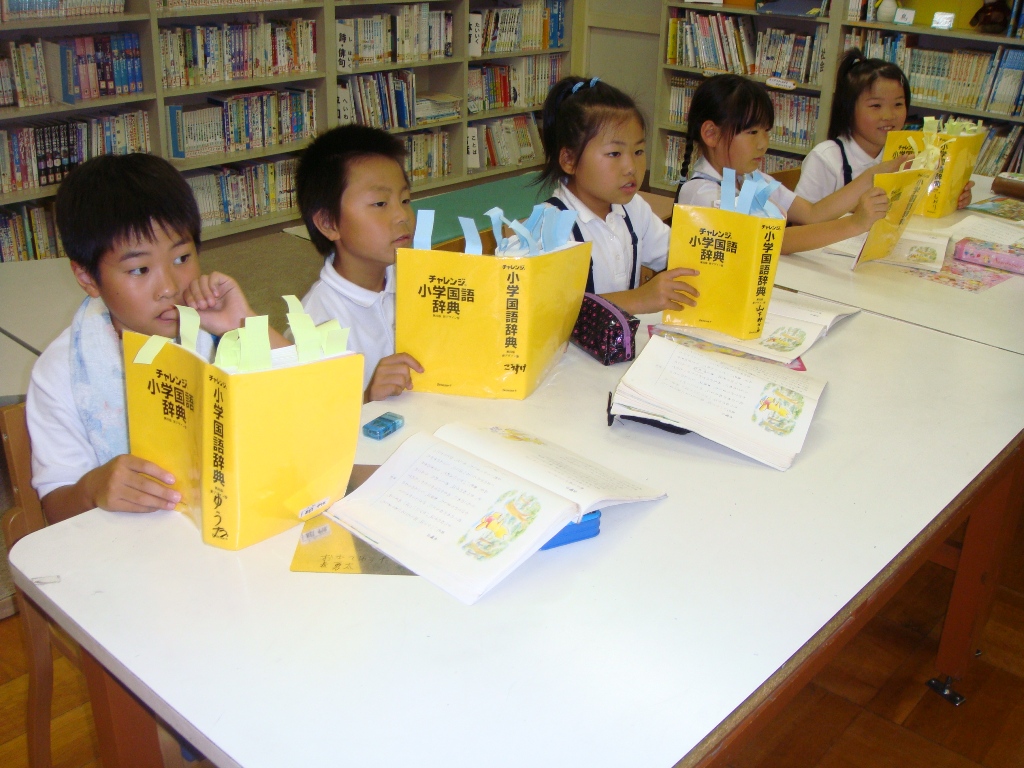 子ども達の語彙力を高めるために、分からない言葉が出てきたら、辞書を引いて調べ、引いた言葉に付箋を貼ります。頑張った分だけ付箋が増えるので子どもたちにとっては成果が目に見えて学習意欲が増す効果があります。以前、テレビで立命館小学校の「辞書ひき指導」を紹介していたのを参考に早速実践しています。1年生の2学期からマイ辞書は使用します。