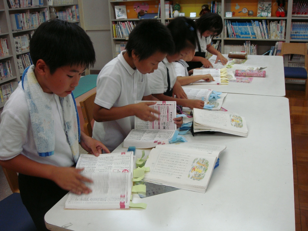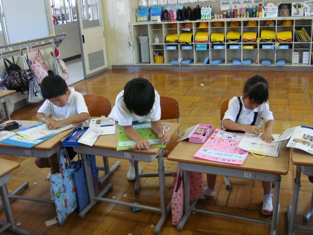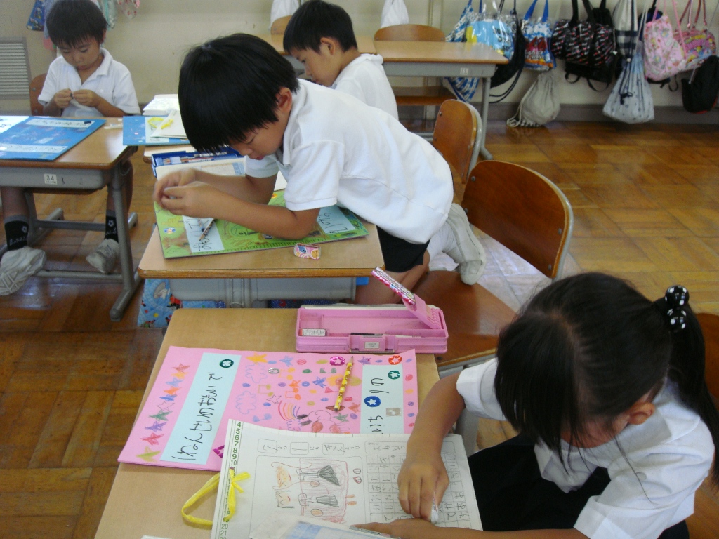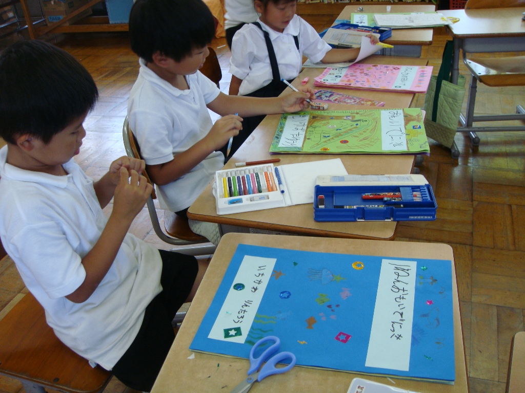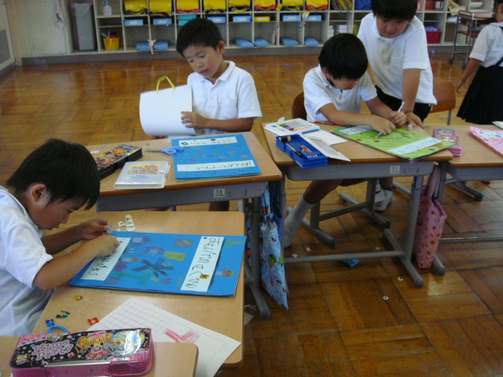 1年教室では、1学期間に作った図工作品や、生活科の観察記録などを本にしてまとめていました。1つずつだと、ばらばらになりすぐにどこかへ紛失してしまいがちですが、こうしておけば、立派な思い出作品集になります。出来上がった表紙に、思い思いの絵をかいて楽しそうに仕上げていました。
