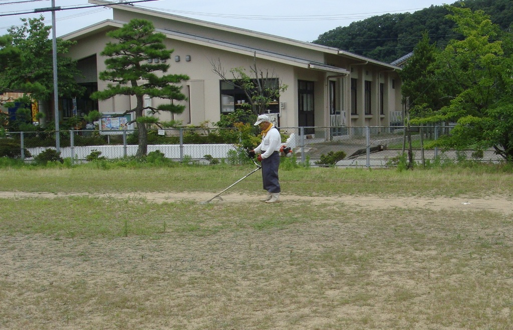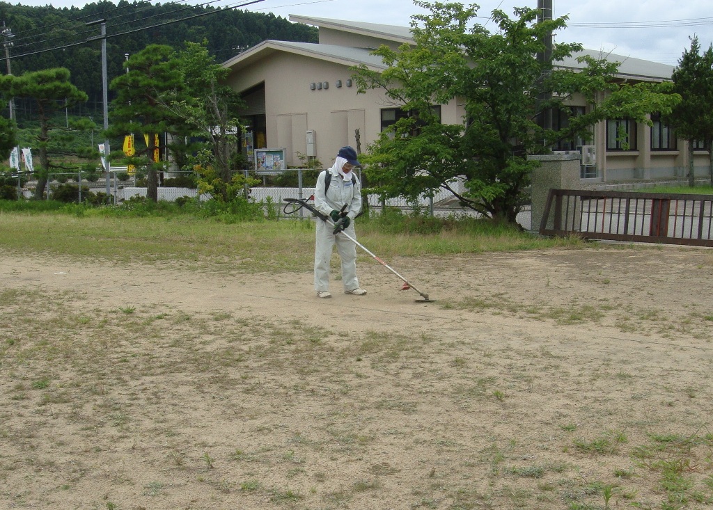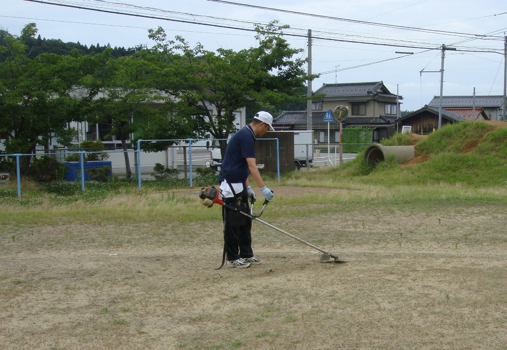運動場は地面にへばり付いた短い草のため、草刈り機がうまく使えず余りはかどりませんでした。