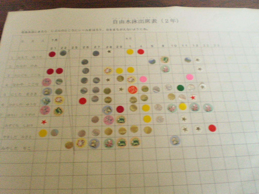 来たら、学年ごとの名簿一覧にシールを貼ります。