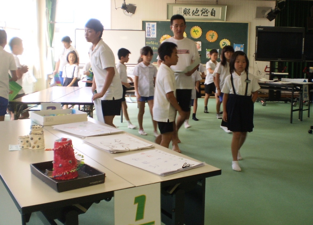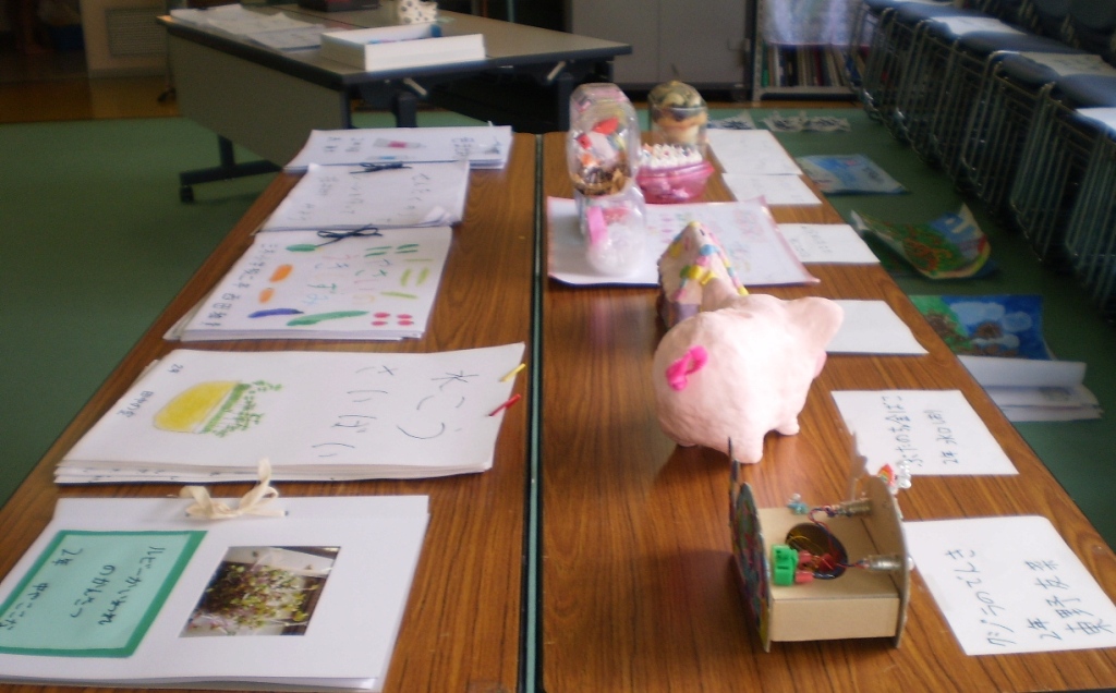 昨日の全校登校日には、夏休み中に仕上げた絵や、研究などを重そうに家から持ちより、早速、視聴室に展示していました。すぐ送らなければいけない応募作品は抜いて他の作品を学年ごとに展示しました。