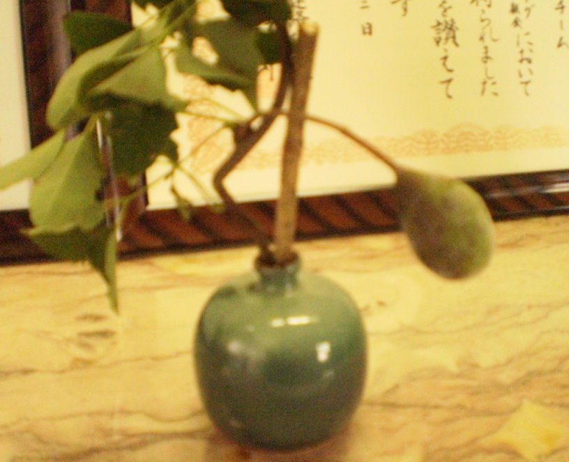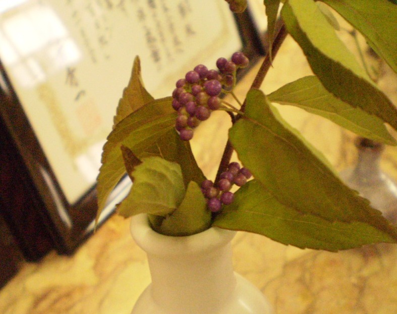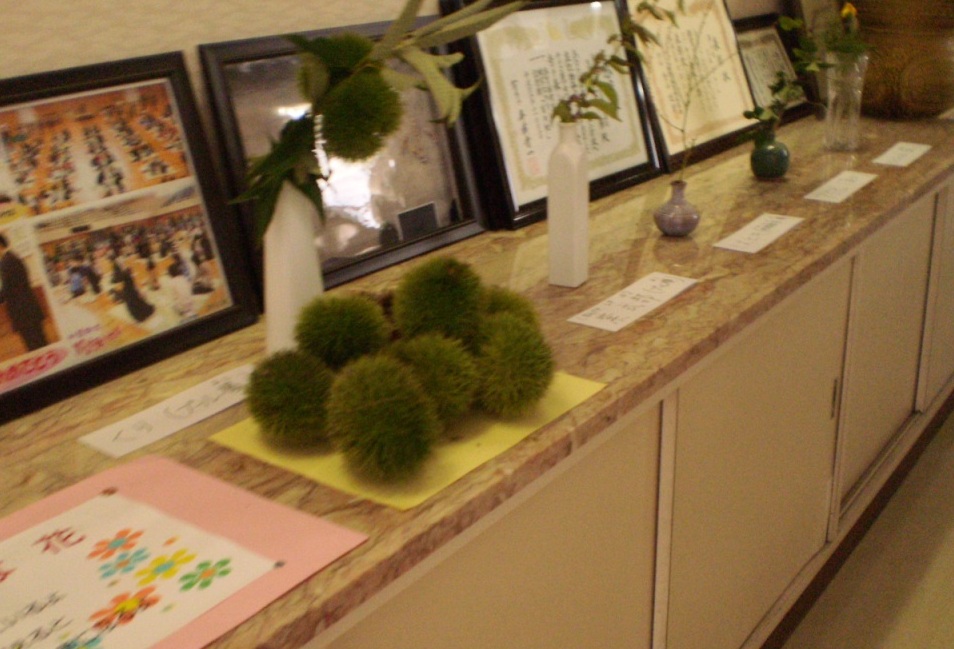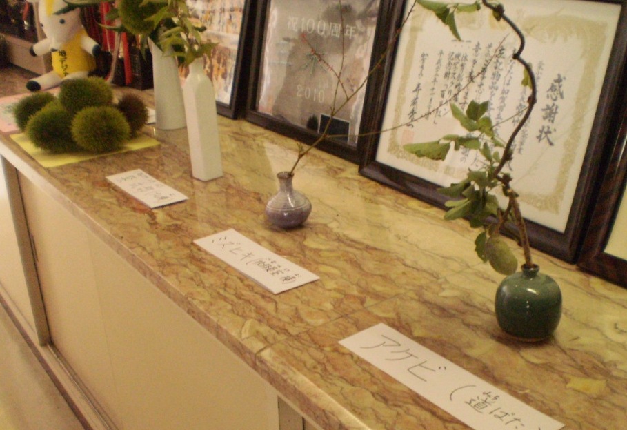 そこで、大きく実った栗の実や、紫式部のかわいい粒粒の実、水引、アケビの実などを飾りました。9月1日に、気付いて見てくれればと思います。