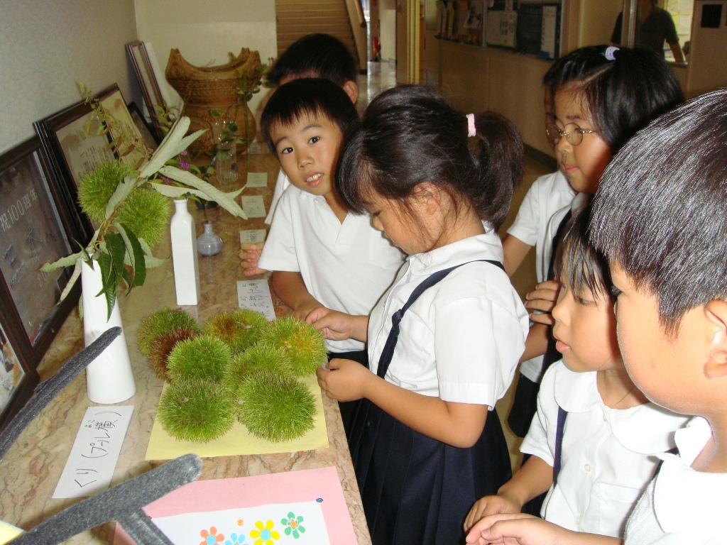 展示してあった栗のイガが、開いて中から栗が顔を出しました。むいてみるとつやつやした大きな栗が現れました。通りすがりの子ども達も、おどろいて見ていました。