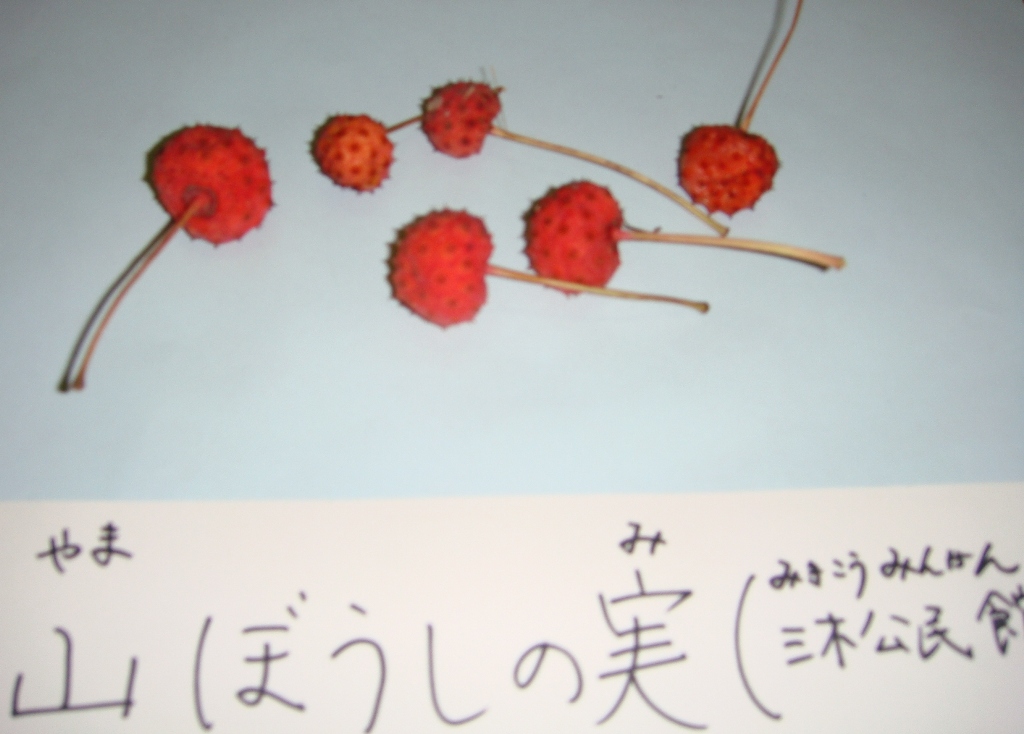 三木公民館のヤマボウシが、サクランボ大のかわいい実を付けていました。落ちていたものを展示しました。早速5年生のTさんが気づいてくれました。「なんか珍しいのがある。」と呟いたTさんに「それ、かわいいでしょ。公民館の木の上の方を見てみるとなっているよ。」と声かけしたら「はい、分かりました。見てみます。」と言ってくれました。