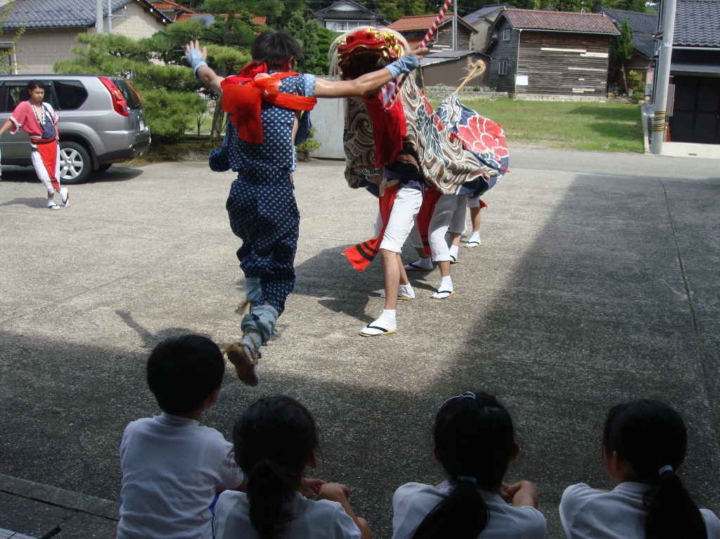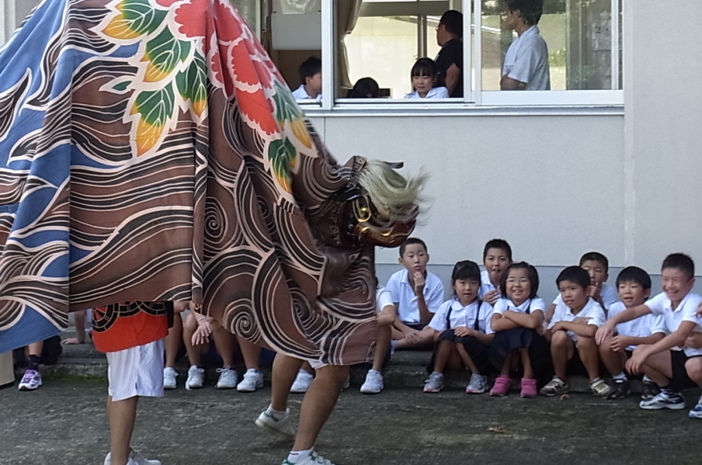 三木地区では、稲刈りが済み、各町で秋祭りのまっ最中です。今、獅子舞を見ている子どもたちが、やがて青年団として獅子舞を受け継ぐ若者になって、三木校下で社会人として残ってほしいものです。