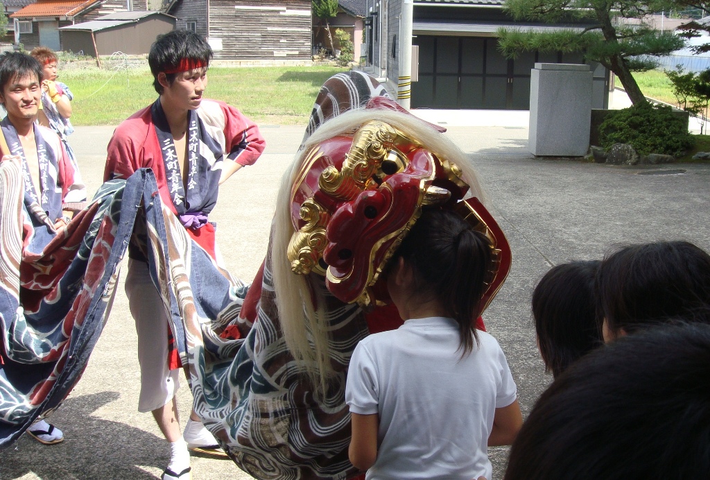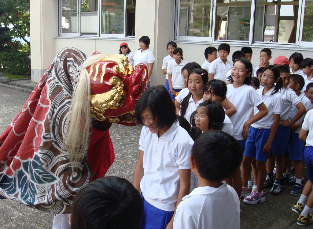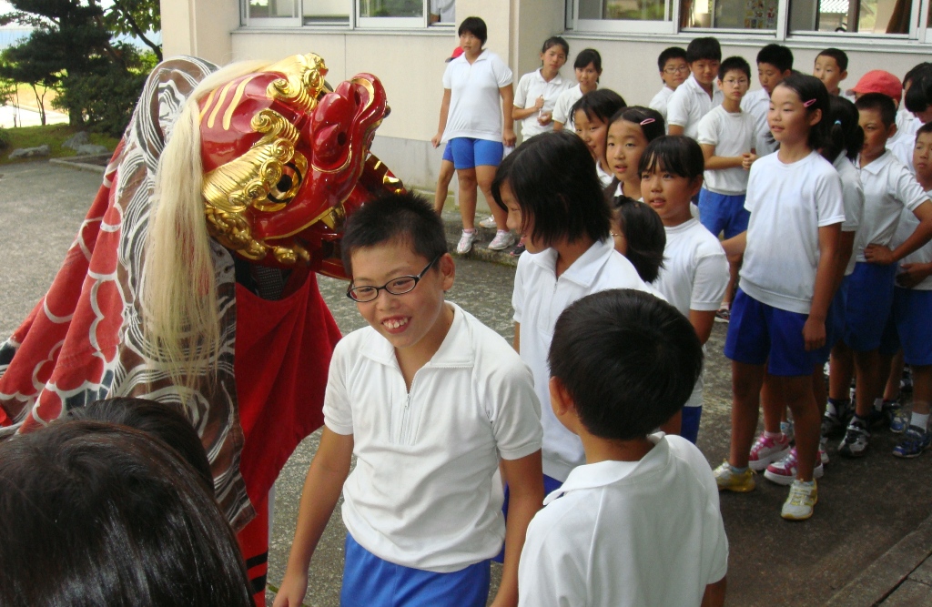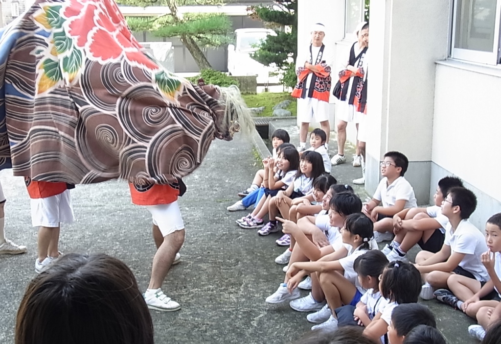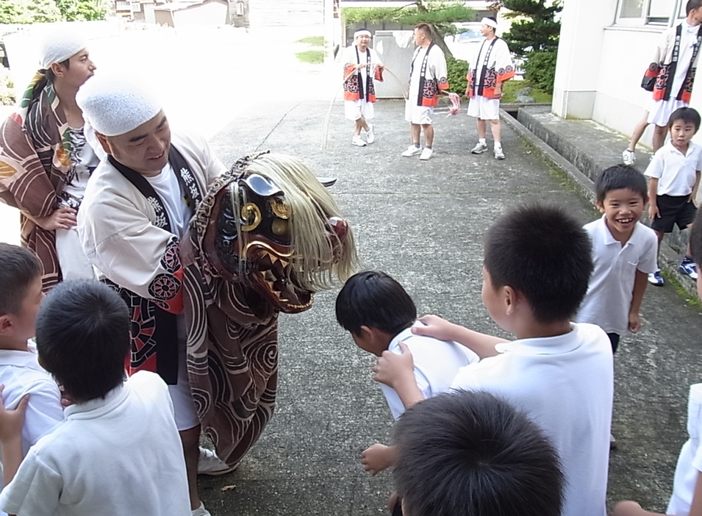 9日の昼休み、熊坂町の獅子舞が学校にやってkました。まるで獅子が生きているように動くので、低学年は怖そうな顔で見ていました。最後に、獅子頭に頭を噛んでもらいました。
