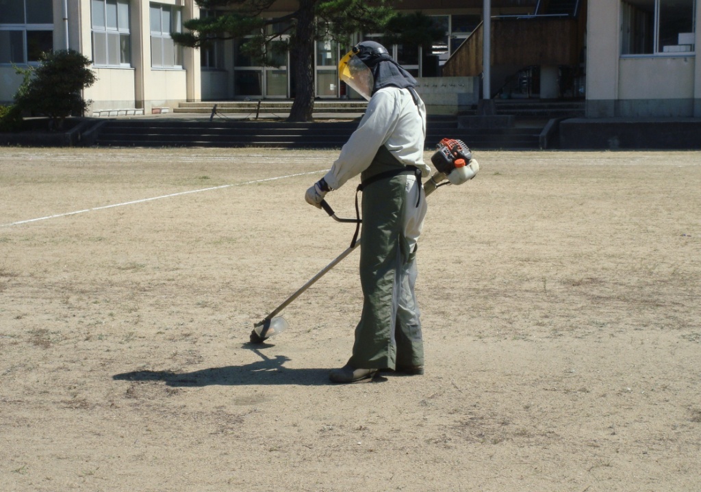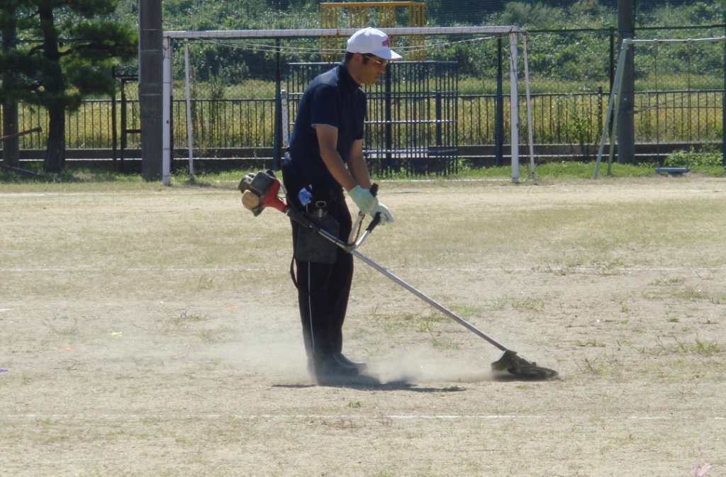 連日の日照りで運動場の草は、丈が短く乾燥していて、砂を削るように機械を操作しなくてはならないため、大変です。砂煙が目に砂が入らないよう、大きなカバーで顔を覆い、長袖長ズボンの重装備でした。