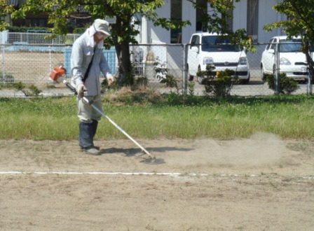 真夏日の今日、シルバー人材センターから3名の方が来て運動場の除草作業をして下さいました。教頭も授業の合間をぬって加勢し草刈り機の音が鳴り響きました。