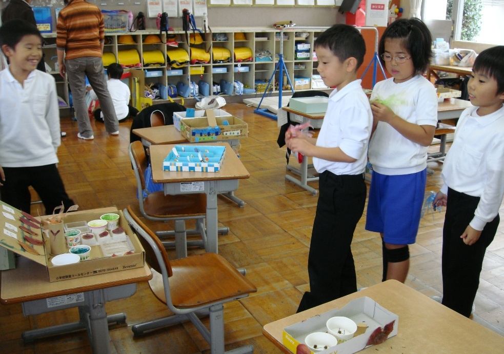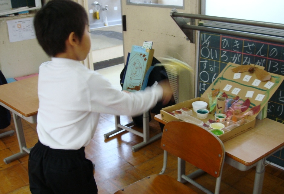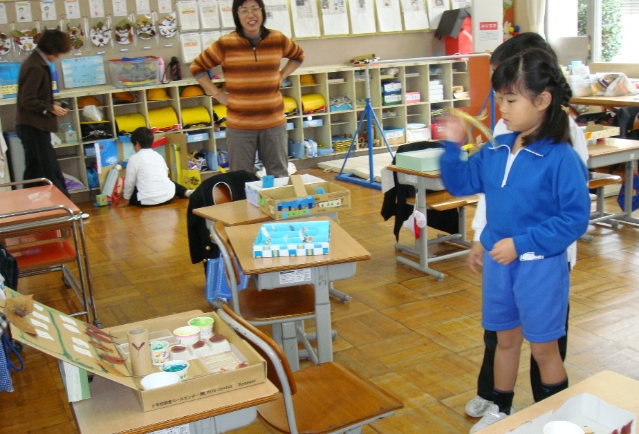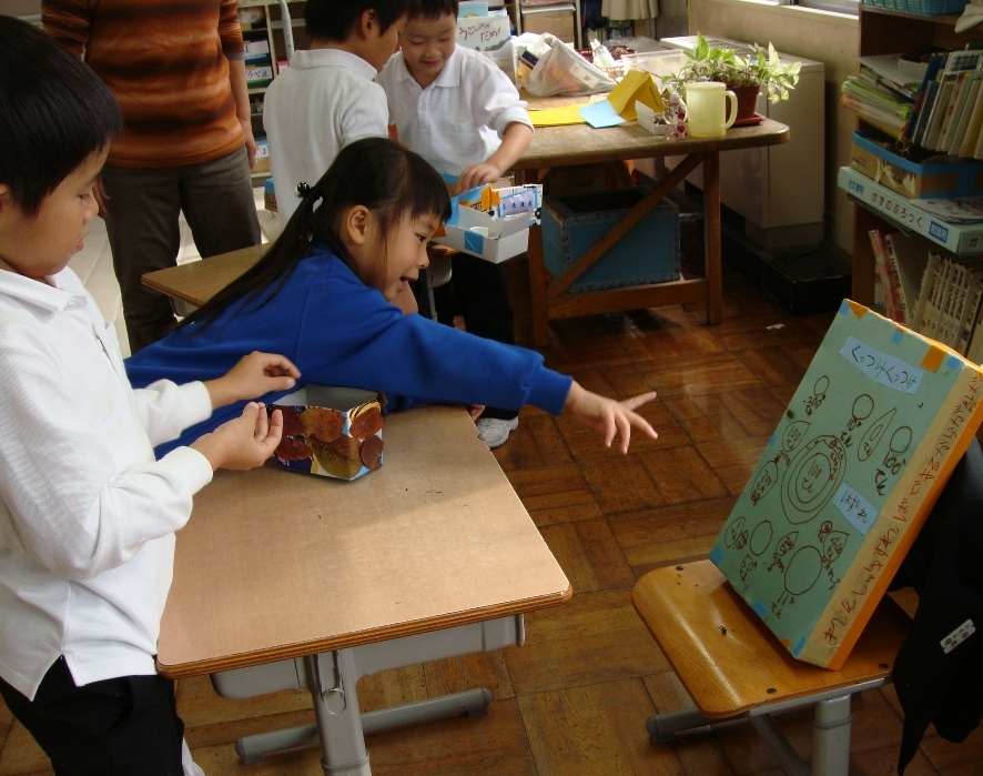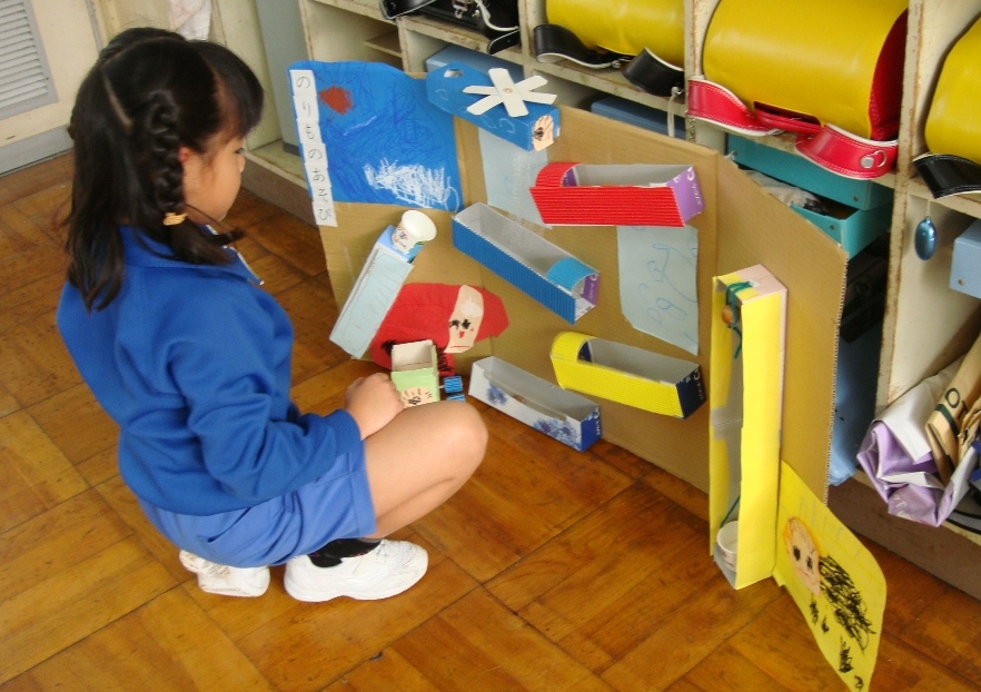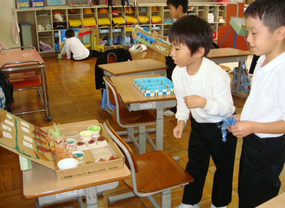 1年生が、生活科で、どんぐり、ひっつきむし(アメリカせんだん草)、落ち葉などを使って秋のおもちゃランドを楽しんでいました。迷路や的当てなど自然の物と空き箱などを利用して作りました。