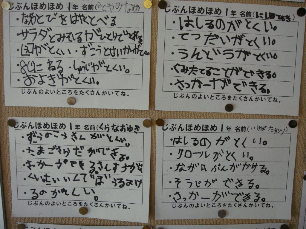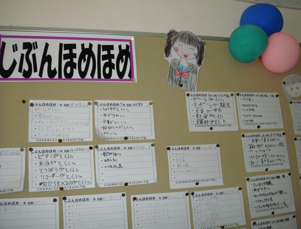 廊下に「自分ほめほめ」「友達ほめほめ」カードが掲示してあります。自分にはこんな良いところがあるんだと改めて気づき自己肯定感を高める材料にします。友達からも、自分では気づかぬ良さを認めてもらい嬉しい気持ちになります。