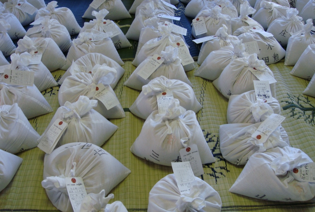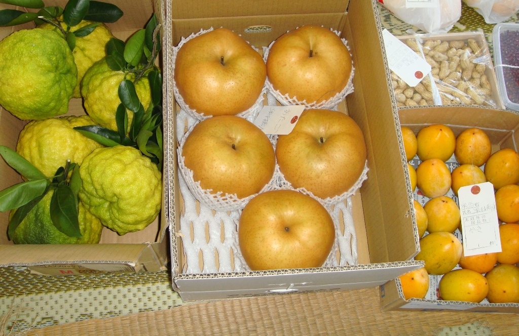 早朝から、学校に三木地区でとれた野菜や果物が次々と役員さん方によって運ばれてきました。お世話様です。見事な野菜や果物に、子ども達も職員も驚いています。午後から、品評会の審査をして、明日は競売にかけます。