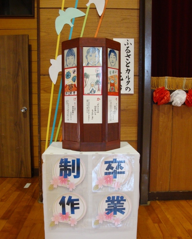 今年度は、「ふるさとカルタ」と自画像の陶板を貼った