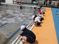 5年生はプールサイド、6年生はプールの中をたわし等を使って磨きました。