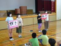 班長は,班の合言葉を全校に伝えました。1班は「輝き」2班は「協力」3班は「チャレンジ」4班は「友情」でした。班のみんなで力を合わせ,支え合い,合言葉にふさわしい縦割り班になっていきましょうね。