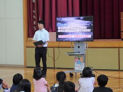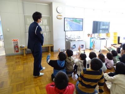 1~3年生は,安全な横断歩道の渡り方などについてのビデオを見たり,学校前の横断歩道を実際に渡ったりしました。「渡る前に右左右を見て確認すること」「周りを見ながら歩いて渡ること」など,命を守るための大切なことを確認することができました。