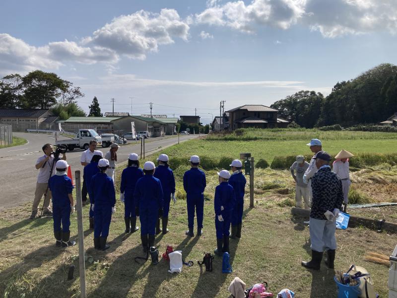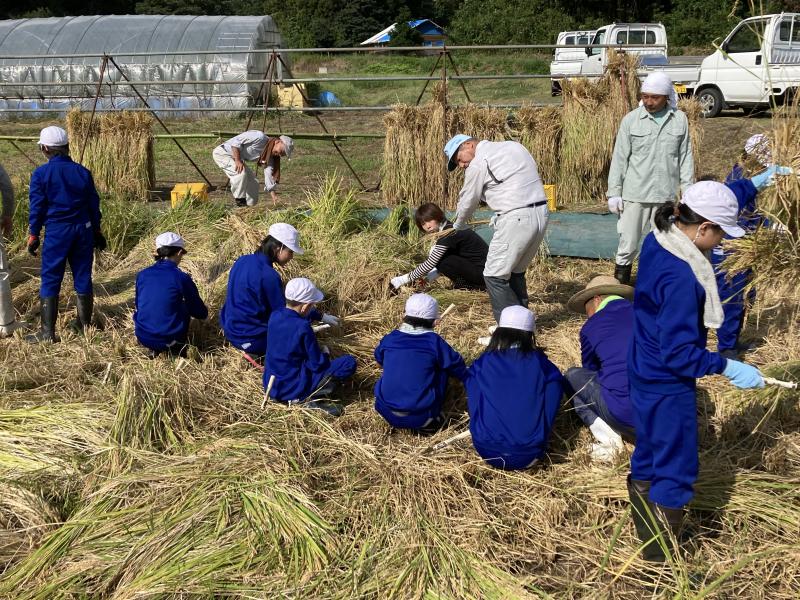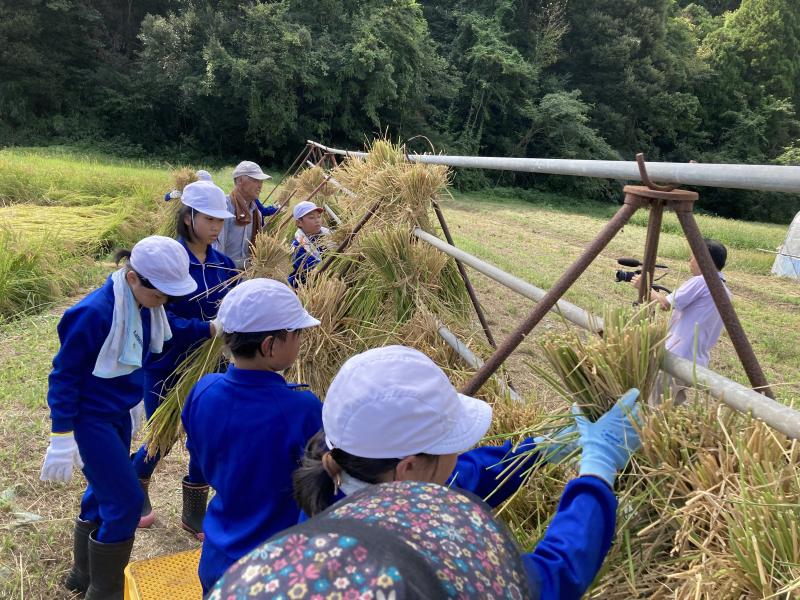 本日,5年生が学校田の稲刈りをしました。地域の方々に教えてもらいながら,架干しもしました。10日ほど干すそうです。5年生は,腰を曲げて刈り続けることがとても大変であることを身に染みて感じていました。また,田植えから稲刈りまでの一連の米作りを通して「米作りの大変さ」や「お米のありがたさ」も感じているようでした。
