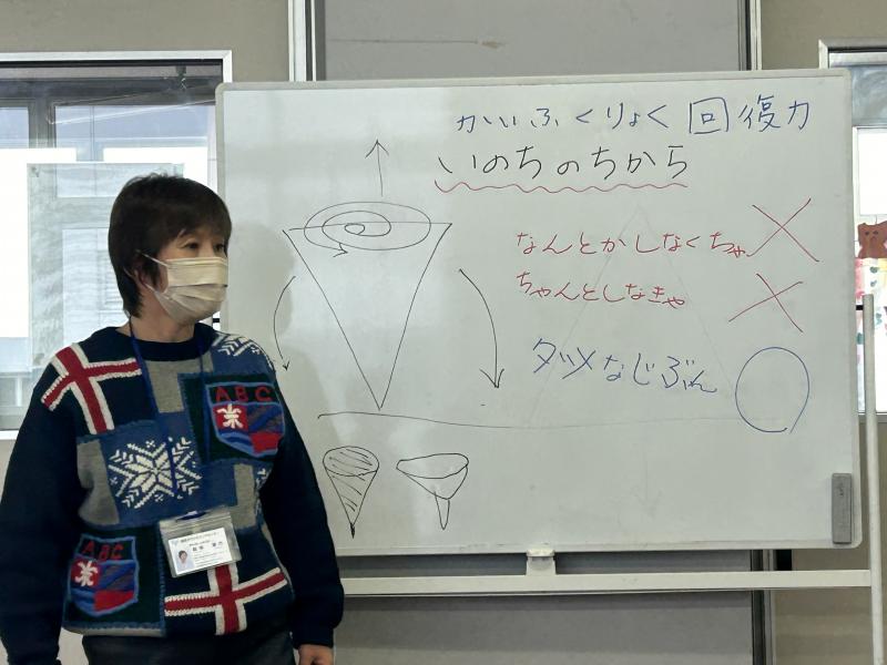 今日は、文部科学省から派遣されたカウンセラーの飯塚康代さんから「リラクゼーション」と「回復力」についてお話を聴きました。臨床心理士でもある飯塚さんは福島県からいらっしゃいました。ご自身身が東日本大震災で被災されたそうです。能登半島の地震で、「子どもたちはどうしているだろう」と駆けつけてくださりました。