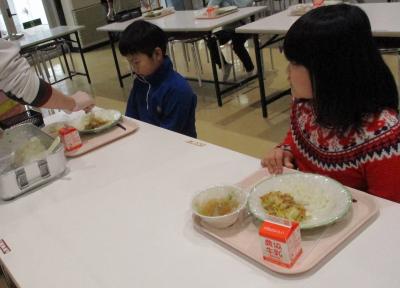 ご飯、牛乳、厚揚げの味噌炒め、中華スープでした。今日の給食の点数をきくと「1万点!」と笑顔で答える児童や、給食再開にあたって関わってくださった方々への感謝の気持ちを語る児童もいました。明日の給食も何だろう?と今からワクワクしています。