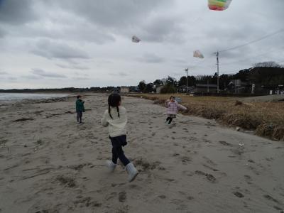 冬の晴れ間。1年生が生活科の時間にたこあげげをしました。