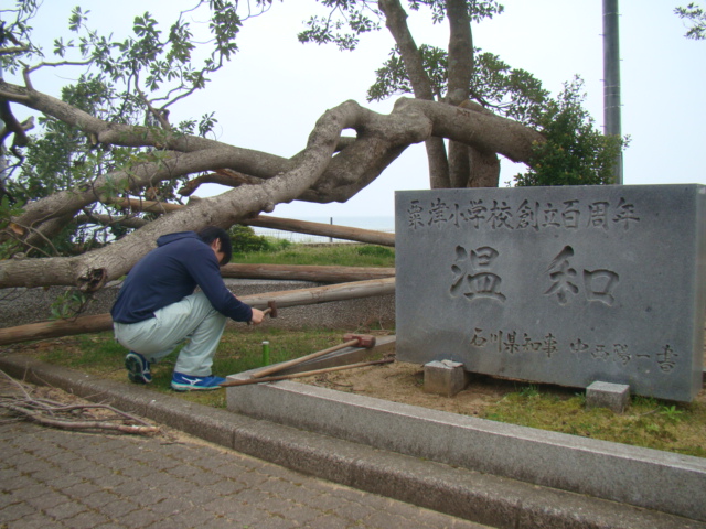 横のタブノキにも支柱を苦労して取り付けました。すっきりと見晴らしがよくなりましたがタブノキは健在です。ご安心ください!!