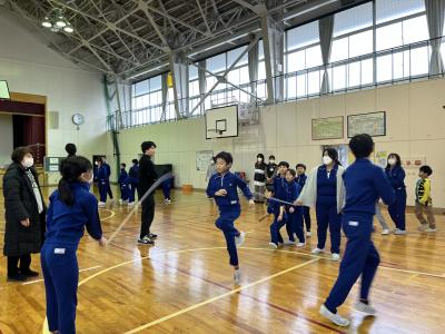 代表委員長が「こんな時だけど、元気あふれるなわとび集会にしましょう」とあいさつがありました。各学年の代表による発表に続いて、「8の字とび」「持久とび」が行われました。