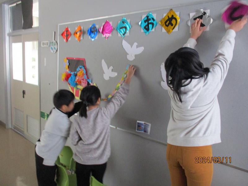 6年生をお祝いの気持ちで送り出すために,各学年で協力して飾りつけをしていました。