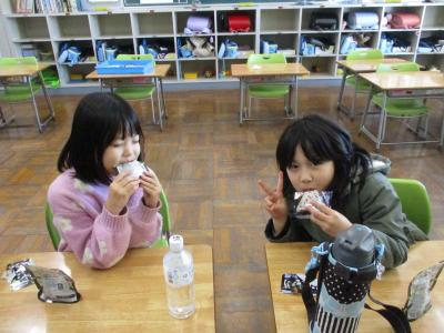 写真は、水曜日の昼食、おにぎりとフルーツを食べている様子です。