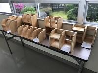 2年生技術の木工作品が仕上がりました。板を切り、釘で打ち、サンドペーパーをかけ、ニスを塗って完成しました。用途やデザインを考えて、自分の力で作った世界で一つの作品です。どうぞご覧あれ。