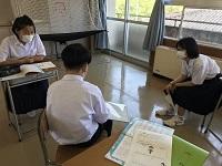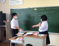 英語の時間は、ペアで入国審査の場面を想定し、練習しました。役人と旅人とに役割分担し、自分で架空の設定をしてやりとりする学習です。7人ですから、高堂先生も入って、何度も練習できました。最後には、7人全員が「入国審査」での英会話が身に付いていました。すばらしかったです。