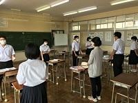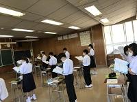 音楽の時間は、マスクを着用しての歌唱の学習でした。ソーシャルディスタンスをとって、実際に歌うのは短時間でと、坂瀬先生が計画して行ってくれました。校歌はちょっと控えめでしたが、「We,ll Find the Way」では歌が上手な1年生の本領発揮となりました。曲のイメージを出し合い、共有してから歌ってみましたらば、「明るい未来がやってくるイメージ」「力強く前進するイメージ」という皆さんの出したイメージに近づいて聞こえました。今後の仕上がりが楽しみです。