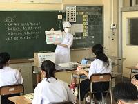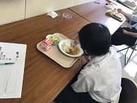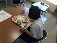 今日は、保健給食委員の生徒が2人、カレーとミモザサラダに挑戦。センサーをあごに付け、頑張ってくれました。皆さんもよく噛んで食べてください。