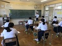 体育は、3密を避けながら、また熱中症対策をしながらのバレーボールでした。グループでアタック練習です。3分ごとにポイントを絞った練習でした。熱心に練習する生徒達に、林先生から「失敗はしてもいい、その後のコミュニケーションが大事なのだ」という激励がとびます。また、3分ごとにポイントを絞った指示があり、みるみる上達していく3年生でした。