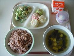 赤飯・すまし汁・三色しゅうまい・シーチキンサラダ・お祝いデザート・牛乳