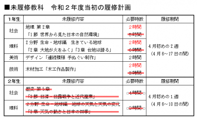 新学期に入って1週間。各教科の授業がスタートしました。昨年度末の臨時休業のため未履修となった学習内容について,新3年生分の履修が本日修了しました。新2年生分も来週中に修了の予定です。新入生(小学校6年の体育)の未履修分は,年間の学習の中に計画的に配置して学習することとしています。