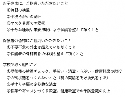 保護者の皆様におかれましても,学校の対策についてご理解をいただき,子ども達の安全と学習の機会補償についてご協力を賜りますようお願い申し上げます。 新型ウィルス感染症拡大防止対策について.pdf