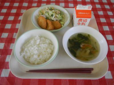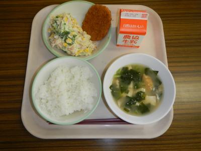 2025/5/12 ご飯、牛乳、鮭チーズフライ、マカロニサラダ、油揚げのみそ汁