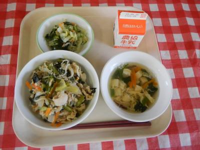 2025/5/27 小松菜の日 小松菜豚丼、牛乳、しらす和え、かきたま汁
