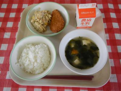 2025/4/8 ご飯、牛乳、コロッケ、マヨネーズサラダ、ニョッキのコーンスープ