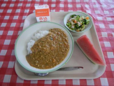 2025/7/4 キーマカレー、牛乳、マセドアンサラダ、スイカ