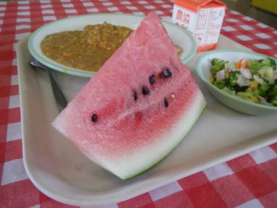 熊本から支援とし「スイカ」をいただき、給食とともに頂きました。