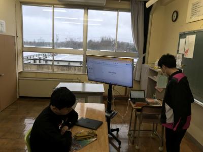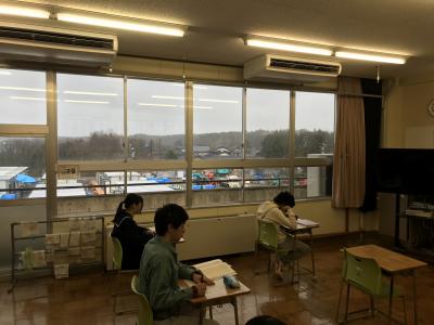 2月19日(月)、2月も4週目に入りました。3年生は、入試に向けて学びの総まとめに入っています。復習を含めて集中して授業を受けています。1.2年生は、期末テストに向けて学年のまとめに頑張っています。その姿の向こうに、仮設住宅が見えるようになってきました。毎日、工事現場の方々が少しでも早く、避難者の方々に仮設住宅に入ってもらうことができるよう、働いていらっしゃいます。その姿を見て、私たちもエネルギーをもらっています。