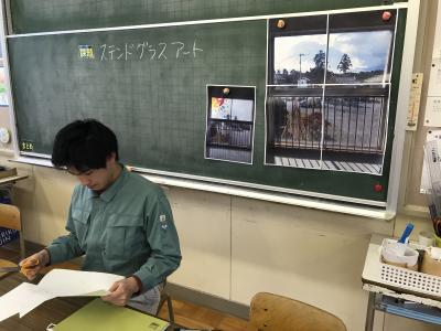 2月21日(水)、現在3年生は、美術の時間に卒業制作に取り組んでいます。踊り場の窓ガラスにカラーフィルムでつくった文字や絵を貼り付けて作成します。今日は、貼り付けるための文字や絵を描いたカラーフィルムを切り取る作業が中心でした。自分たちの思いを表現した作品になるよう、頑張ってください。
