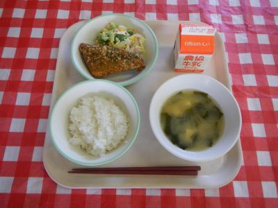 2025/5/30 ご飯、牛乳、さばのカレー揚げ、野菜の味噌マヨ、わかめのみそ汁