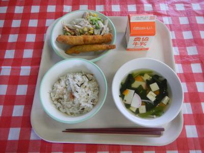6/4かみかみ献立 梅昆布ご飯、牛乳、シシャモフライ、かみかみサラダ、ほうれん草のすまし汁