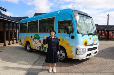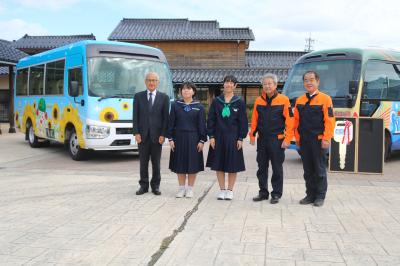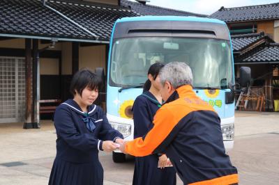 10月29日(火)、国際開発救援財団(FIDR)様から珠洲市に寄贈された、マイクロバスの贈呈式がありました。2台寄贈されたうちの1台は、本校の畠田彩羽さんのデザインが採用され、「ひまわり号」と命名されました。もう一台は、「つばき号」と命名され、この2台は、今後、児童生徒の移動に活用される予定です。畠田さん、おめでとう。ひまわり号とつばき号、珠洲の子供たちのために、がんばってください。
