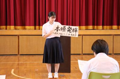 10月4日(水)後期生徒会の認証式と生徒集会が行われました。執行委員のマニュフェストを踏まえながら、会長、副会長、執行委員の3名がしっかりと挨拶を行いました。校長先生からは、任命書の重さと投票をした全校生徒で協力して、よりよい三崎中を目指して取り組んでほしいというお話がありました。その後、生徒集会では、各委員会からの取組計画が発表され、質問と答弁が交わされました。一人一人が参画意識をもって生徒会を動かしていけるように、ぜひ、今日の集会での話し合いを生かしていってほしいと思います。
