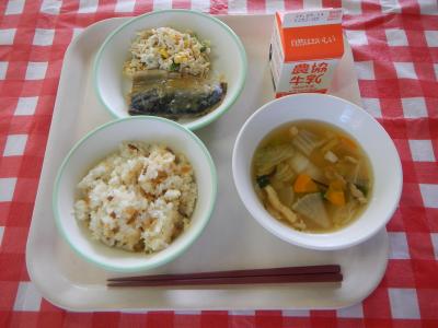 2024/9/6 黒豆ごはん、牛乳、魚の塩焼き、ごまみそ和え、お麩のすまし汁