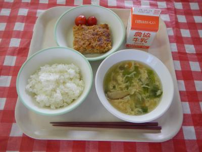 2024/9/10 ご飯、牛乳、チーズ入りミートローフ、ミニトマト、レタスの卵スープ